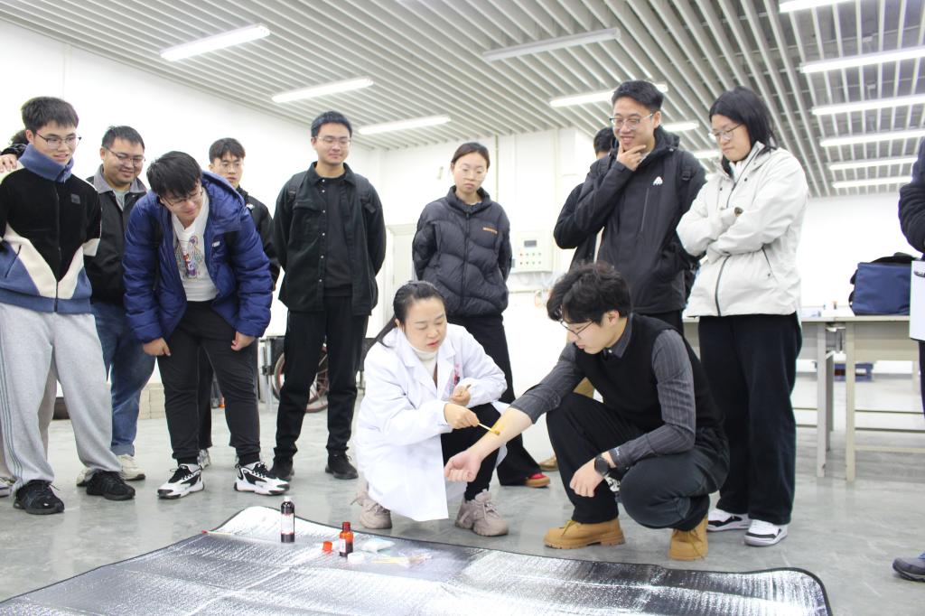 本环节模拟使用机械过程中造成外伤流血的场景。当事故发生后,救援人员第一时间切断危险源、检查伤员意识,采取紧急救援措施。医护人员演示了外伤、断指及骨折等机械伤害的应急处置措施,指导学生在保证安全的前提下实施有效救护。同时,演练还涵盖了事故报告、呼叫救护车等处置流程。
